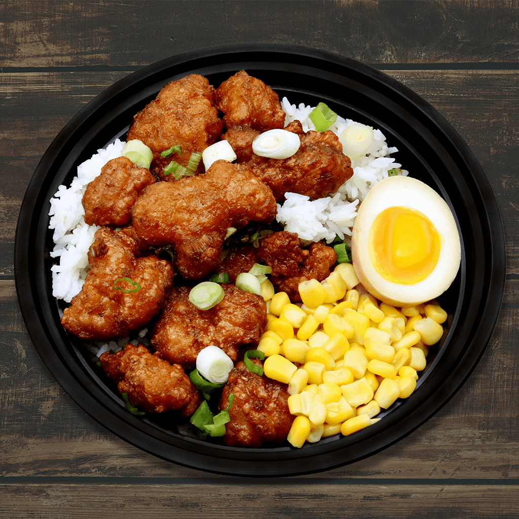 White rice with fried chicken topped with sweet soy sauce with sprinkles of green onion, a boiled egg, & corn on the side