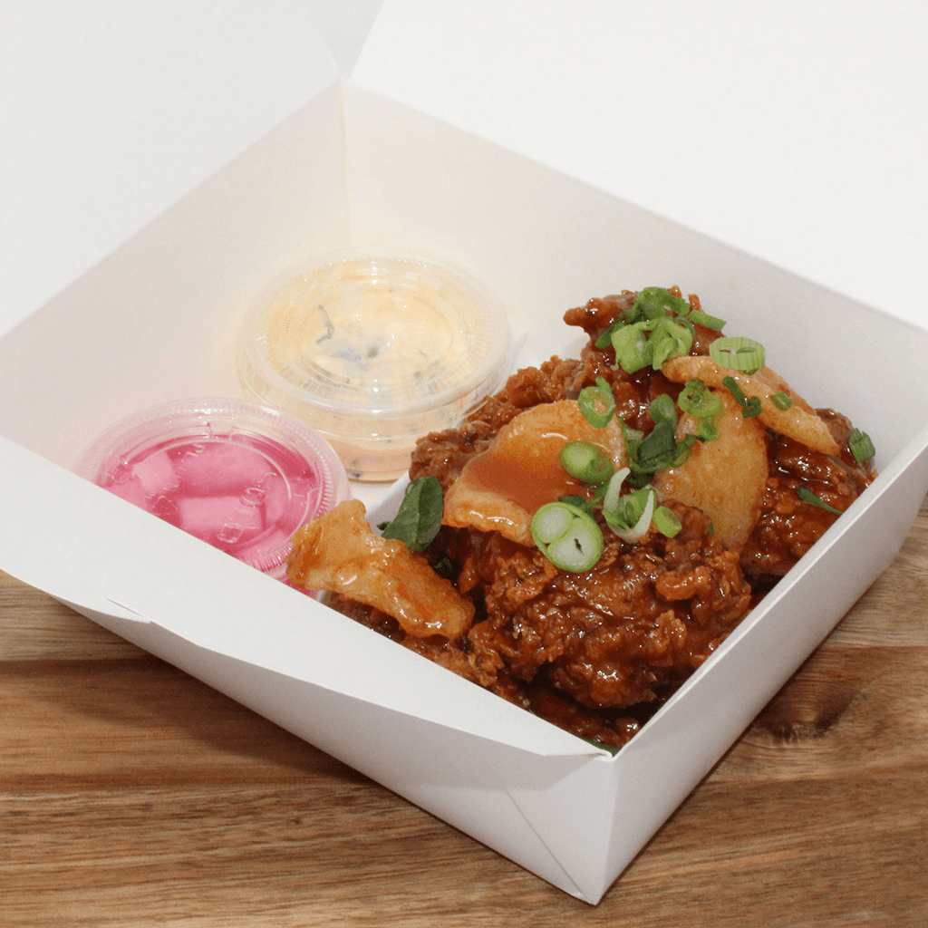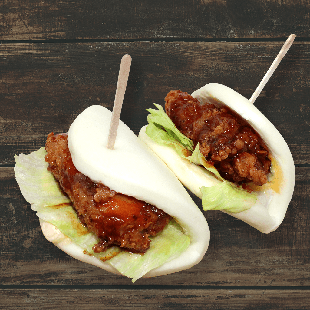 Korean fried chicken, plain or tossed in soy garlic or sweet and spicy sauce, wrapped in a bao bun