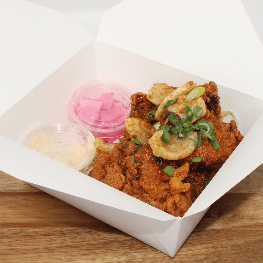 Sweet and spicy Korean fried chicken with fried rice-cakes and a sprinkle of green onions with a side of pickled radish