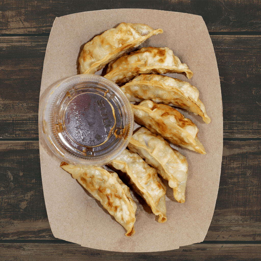 Pork and cabbage dumplings fried in a crispy flour skin, served with gyoza sauce (soy sauce with a touch of wasabi)