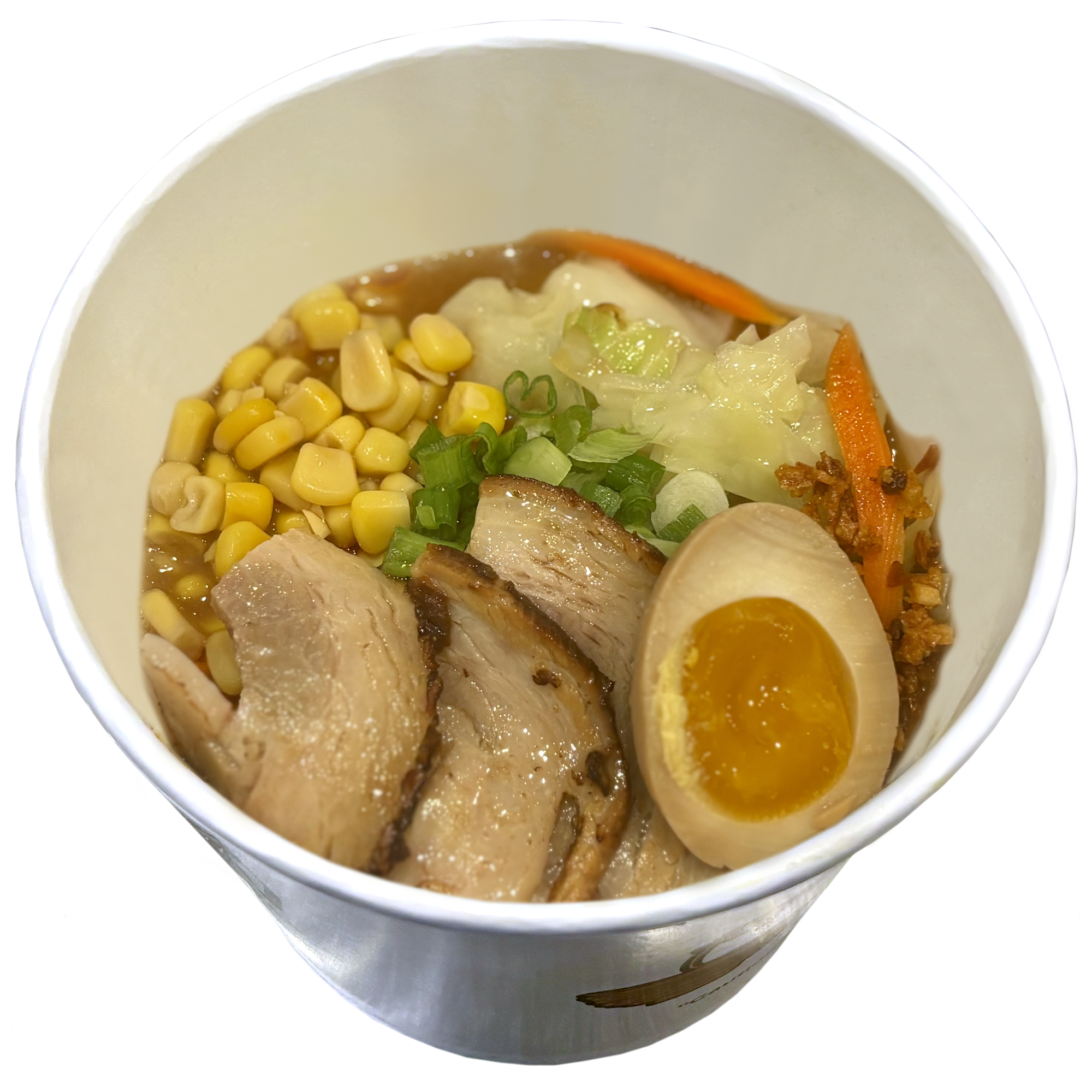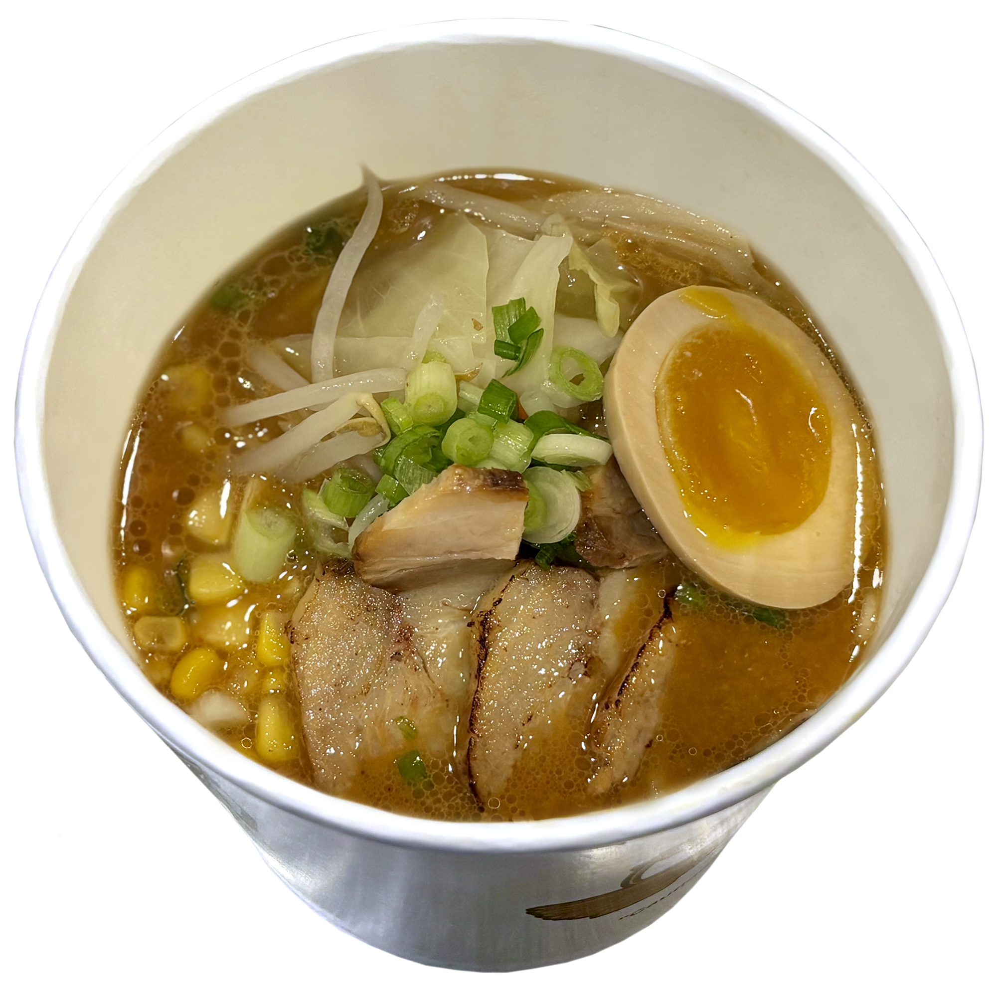 Pork and chicken broth | garlic oil and spicy oil | crushed onion and spicy pepper | stir-fry vegetables (cabbage, bean sprouts, carrots, onion) | corn | boiled egg | green onion | noodles | 2-3 slices of pork (Chashu)