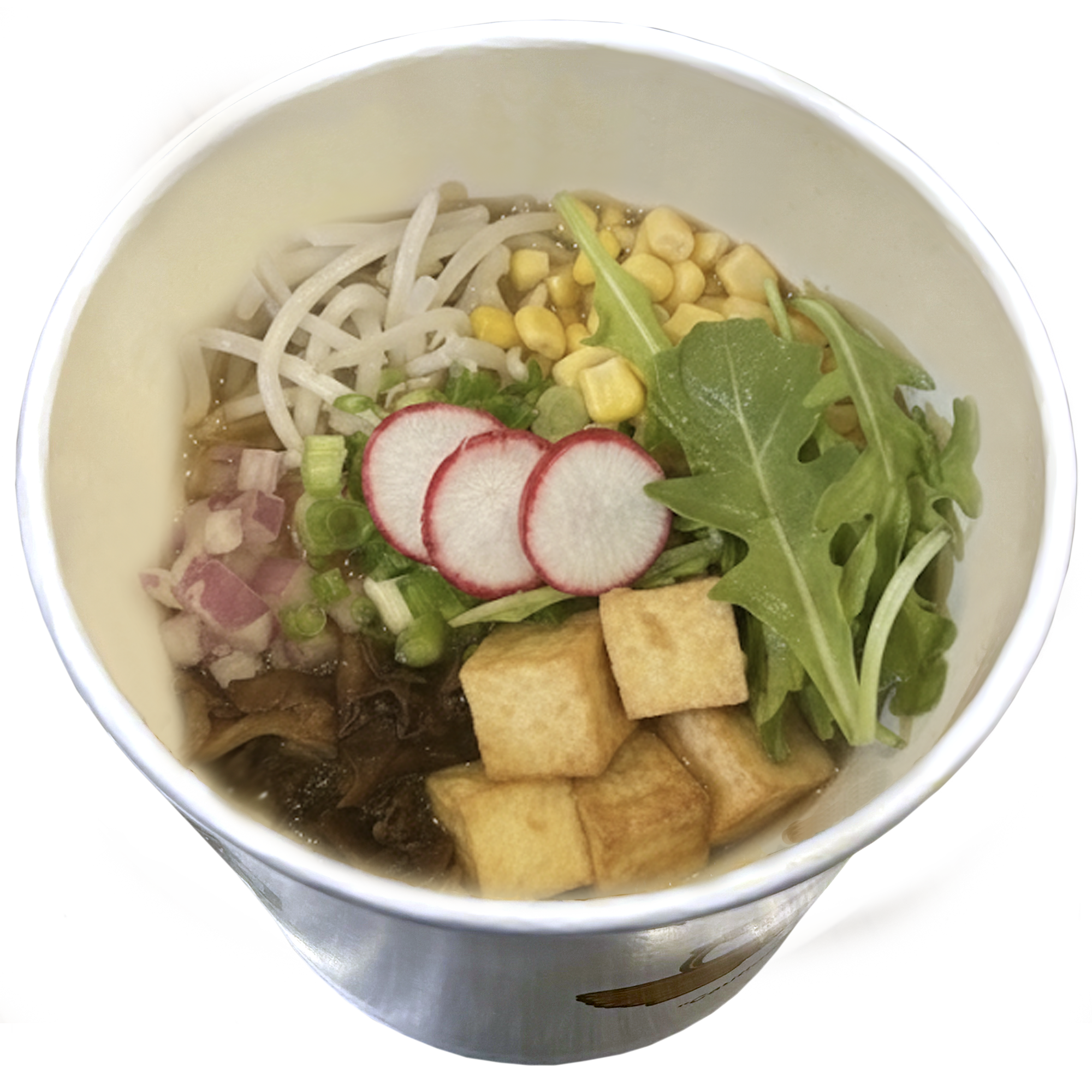 Vegetable broth | garlic oil | corn | bean sprouts | green onion | red onion | purple onion | mushroom | tofu | red radish | baby arugula (Option: add fried chicken on the side)